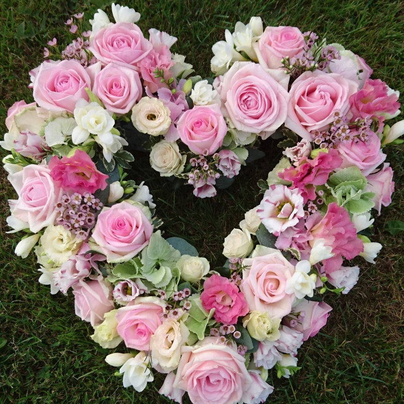 A beautiful heart tribute filled with a delicate mix of seasonal pink flowers
